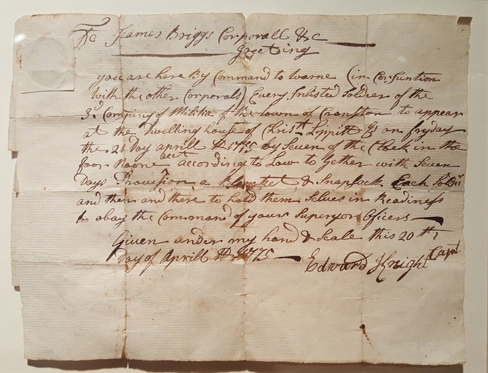 The American Revolution began on April 19th, 1775, when colonists, like Lippitt, took up arms against the British at the battles of Lexington and Concord. The next day, Capt. Edward Knight issued the Militia Mobilization Order to Cpl. James Briggs and Cranston’s 3rd Company of militia gathered at Christopher Lippitt’s farm. There, the enlisted men in the company awaited orders from their superior officers.